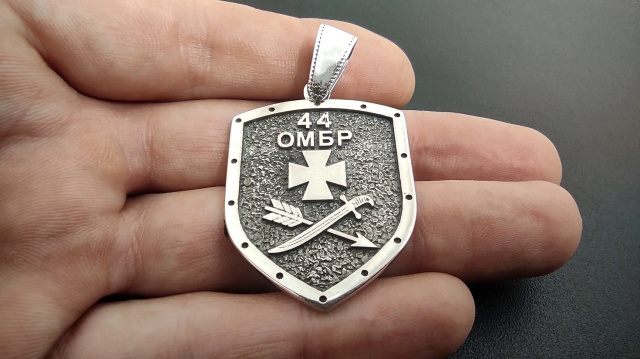 Кулон "44 ОМБр" (Срібло, великий). Матеріал: Срібло 925. Вага: 19,7 грам. Розміри: Висота кулона 40 мм плюс вушко 10 мм. Ширина 40 мм.