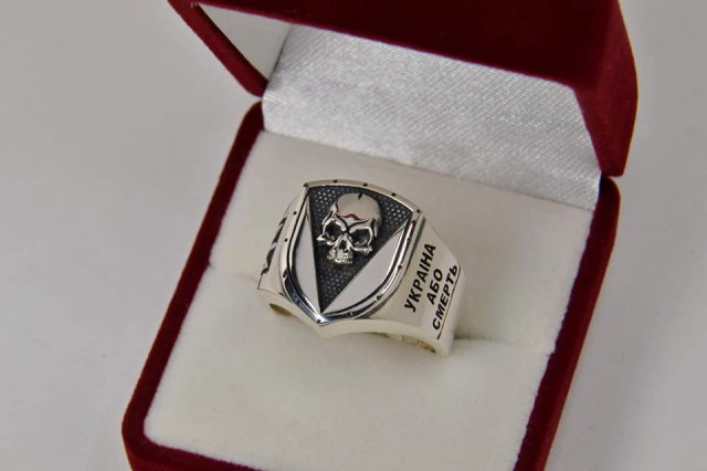 Перстень "72 ОМБр-Україна або смерть" (срібло). Матеріал: срібло 925 проби. Вага: 14 грам (залежить від розміру). Розмір на замовлення