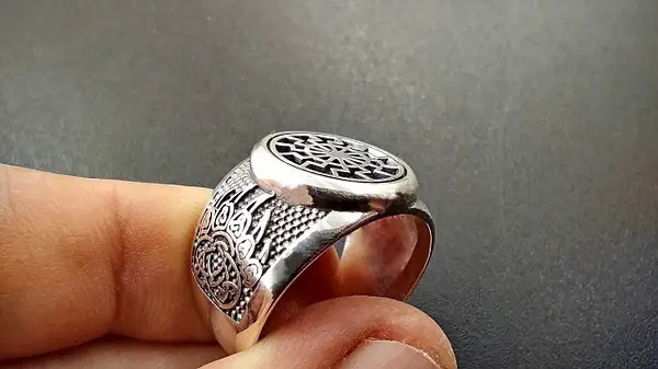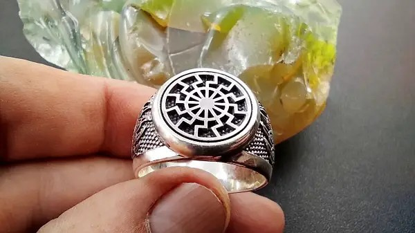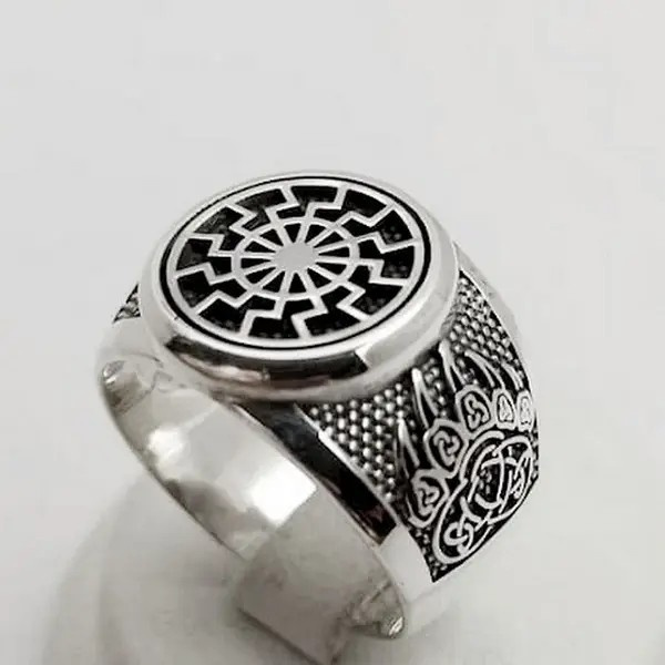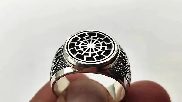Перстень має зображення Чорного Сонця в основній частині і символ Лапа Велеса по боках. Обидва символи мають потужну Силу і походять з давньослов'янських часів. Виготовляється на замовлення.