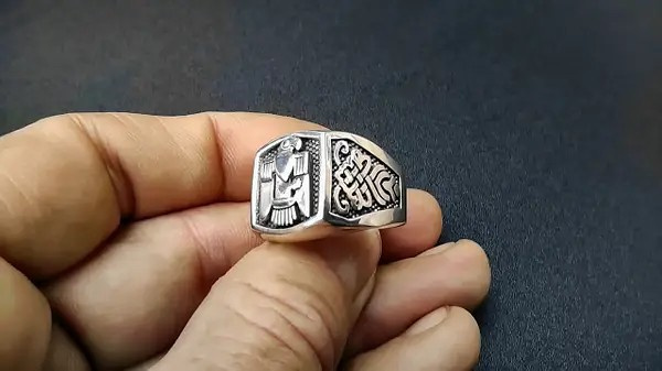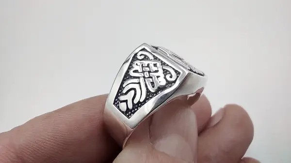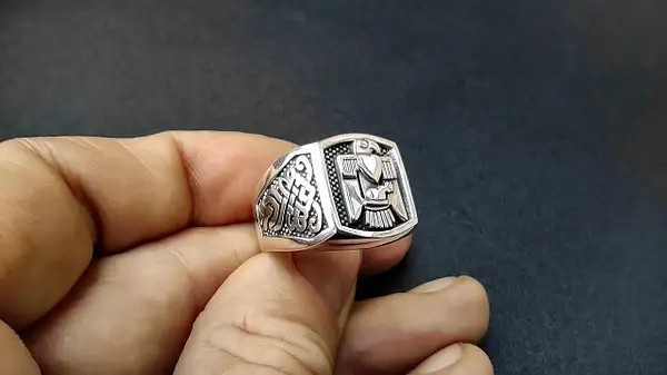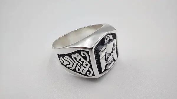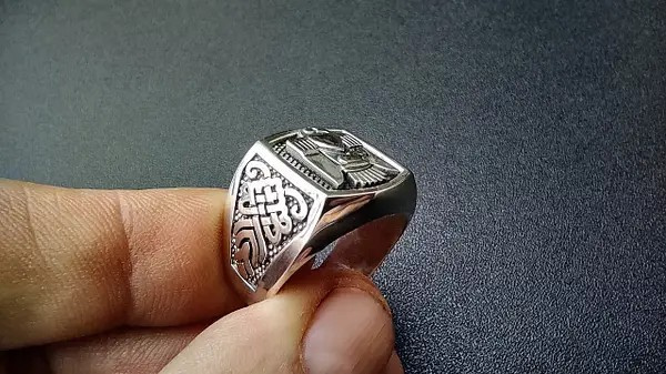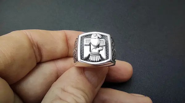 Перстень виготовлено за Скіфськими мотивами. Такий сокіл був вишитий золотом на поясі у Скіфського воїна в одному з поховань. Можлива персоналізація - гравірування позивного чи прізвища внизу персня. Виготовляється на замовлення.