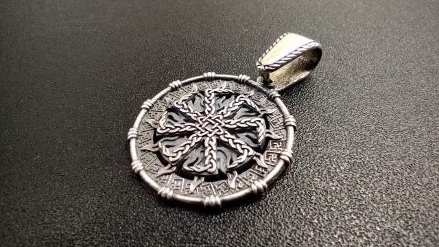 Кулон "Коловрат в Сонці, плетений" виготовляється на замовлення з бронзи або срібла в двох варіантах - 24 мм і 30 мм в діаметрі. Додатково можемо виготовити авторський шнурок з гарними замочками і зробити лазерне гравірування з тильної сторони, наприклад прізвище, позивний, група крові тощо.