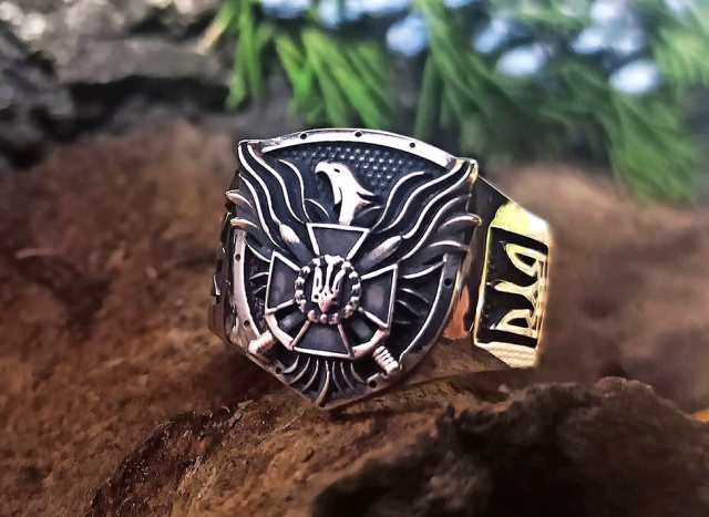 Перстень легендарного підрозділу має забраження емблеми загону і Тризубів по боках.