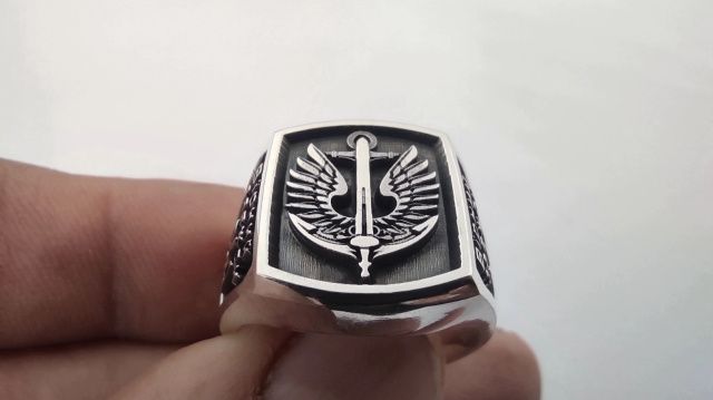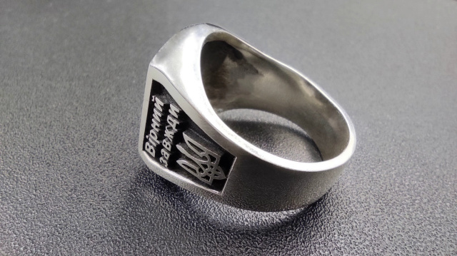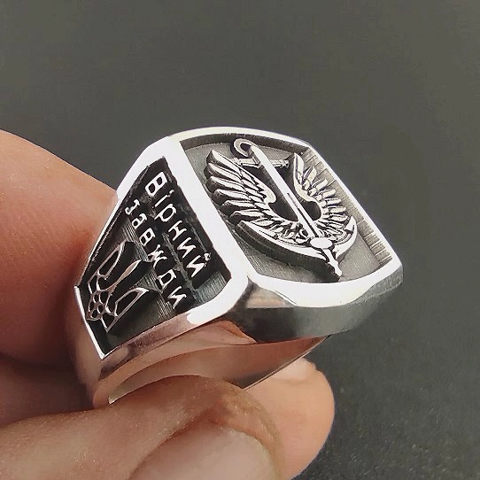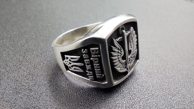 На перстні зображено символ Морської піхоти ЗСУ, й девіз - ′Вірний завжди!′ Можлива персоналізація - гравірування позивного внизу персня.