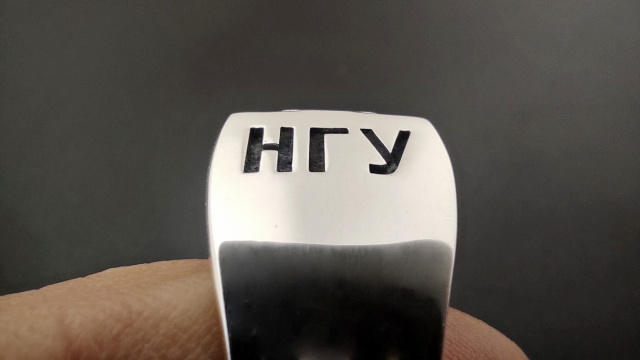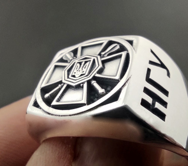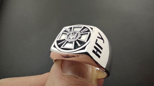 Перстень "Національна Гвардія України" виготовляється з срібла на замовлення. Має зображення емблеми НГУ зверху та Тризуб й напис "НГУ" по боках.