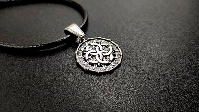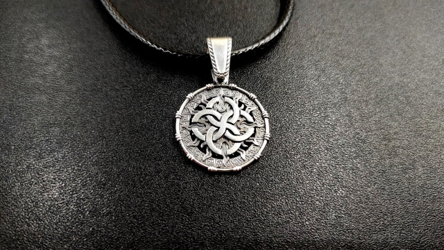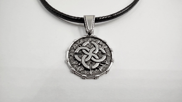Кулон-Оберіг "Весільник в Сонці" виготовляється на замовлення з бронзи або срібла в двох розмірах - 24 мм і 30 мм в діаметрі. Також виготовляємо фірмові шнури з срібними, авторськими замочками на яких зображено Тризуб, Алатир або Цвіт Папороті.
