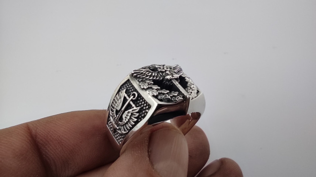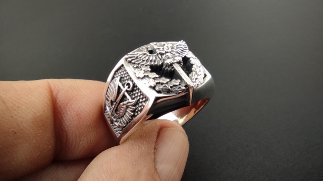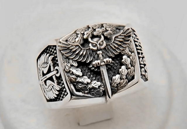 По боках перстня зображено емблему Морської Піхоти України і напис "Вірний завжди". Основне зображення - емблема Воєнної розвідки України. Можлива персоналізація - гравірування позивного внизу персня. Виготовляється на замовлення. Ручна робота.
